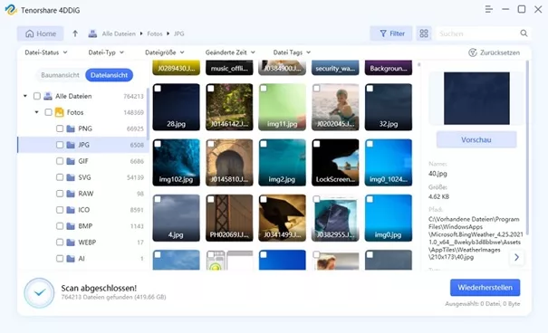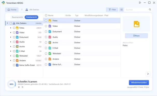 Die Software unterstützt verschiedene Arten von Dateien, einschließlich Fotos, Videos, Musik, Dokumente und mehr. Mit ihrer intuitiven Benutzeroberfläche können Sie schnell und einfach Ihre verlorenen Dateien finden und wiederherstellen. 4DDiG ist auch in der Lage, Daten von verschiedenen Speichermedien wie Festplatten, externen Festplatten, USB-Sticks, Speicherkarten und mehr wiederherzustellen.